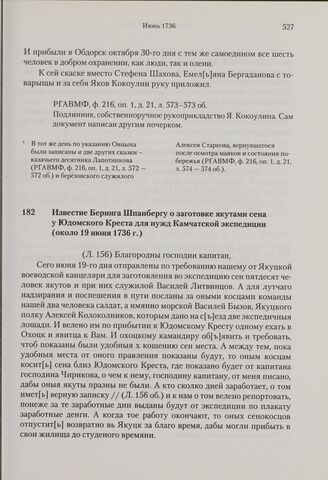 Известие Беринга Шпанбергу о заготовке якутами сена у Юдомского Креста для нужд Камчатской экспедиции. Около 19 июня 1736 г. // РГАВМФ, ф. 216, оп. 1, д. 14, л. 156-156 об.