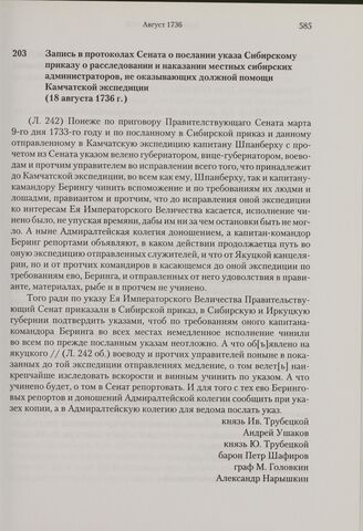 Запись в протоколах Сената о послании указа Сибирскому приказу о расследовании и наказании местных сибирских администраторов, не оказывающих должной помощи Камчатской экспедиции. 18 августа 1736 г. // РГАДА, ф. 248, оп. 33, кн. 2095 (Реестр крепленым протоколам Правительствующего Сената за август 1736 г.), л. 242-242 об.
