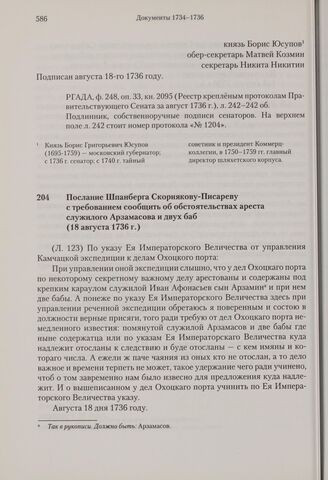 Послание Шпанберга Скорнякову-Писареву с требованием сообщить об обстоятельствах ареста служилого Арзамасова и двух баб. 18 августа 1736 г.