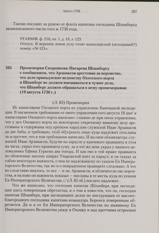 Промемория Скорнякова-Писарева Шпанбергу с сообщением, что Арзамасов арестован за воровство, что дело принадлежит ведомству Охотского порта и Шпанберг не должен вмешиваться в чужие дела, что Шпанберг должен обращаться к нему промемориями. 19 августа 1736 г. // РГАДА, ф. 349, оп. 1, д. 671, л. 85-86.