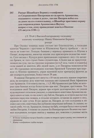 Рапорт Шпанберга Берингу о конфликте со Скорняковым-Писаревым из-за ареста Арзамасова, сказавшего «слово и дело», так как Писарев избил его за донос на его сожительницу, а Шпанберг приставил охрану для сопровождения Арзамасова в Якутск; вопрос о том, кому принадлежит власть в Охотске. 21 августа 1736 г. // РГАДА, ф. 349, оп. 1, д. 671, л. 79 об.-81. РГАВМФ, ф. 216, оп. 1, д. 19, л. 128-129.