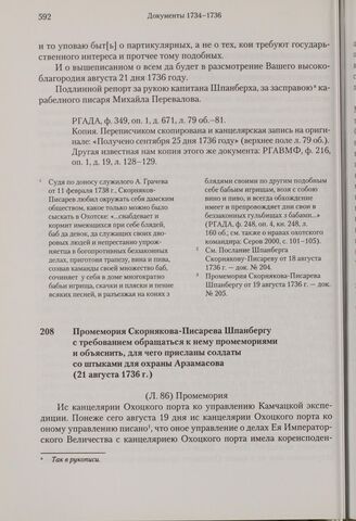 Промемория Скорнякова-Писарева Шпанбергу с требованием обращаться к нему промемориями и объяснить, для чего присланы солдаты со штыками для охраны Арзамасова. 21 августа 1736 г. // РГАДА, ф. 349, оп. 1, д. 671, л. 86-87.