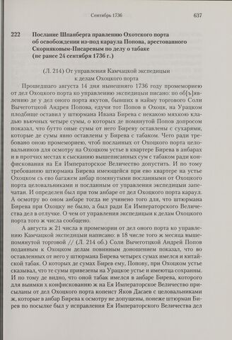 Послание Шпанберга правлению Охотского порта об освобождении из-под караула Попова, арестованного Скорняковым-Писаревым по делу о табаке. Не ранее 24 сентября 1736 г.