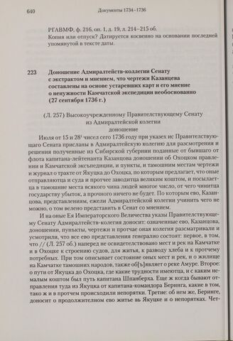 Доношение Адмиралтейств-коллегии Сенату с экстрактом и мнением, что чертежи Казанцева составлены на основе устаревших карт и его мнение о ненужности Камчатской экспедиции необоснованно. 27 сентября 1736 г. // РГАДА, ф. 248, кн. 7312, л. 257-297.