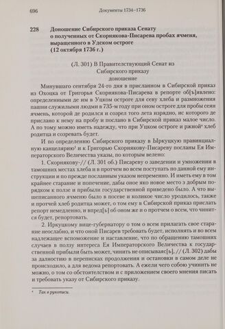 Доношение Сибирского приказа Сенату о полученных от Скорнякова-Писарева пробах ячменя, выращенного в Удском остроге. 12 октября 1736 г. // РГАДА, ф. 248, кн. 7312, л. 301-302.
