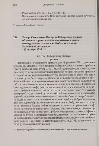 Рапорт Скорнякова-Писарева Сибирскому приказу об успехах торговли казенными табаком и вином и о нарушениях закона в этой области членами Камчатской экспедиции. 29 октября 1736 г.