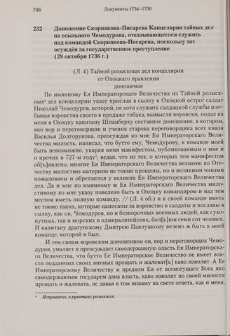 Доношение Скорнякова-Писарева Канцелярии тайных дел на ссыльного Чемодурова, отказывающегося служить под командой Скорнякова-Писарева, поскольку тот осужден за государственное преступление. 29 октября 1736 г. // РГАДА, ф. 7, оп. 1, д. 563, л. 4-5.