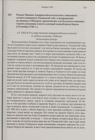 Рапорт Овцына Адмиралтейств-коллегии с описанием летнего плавания в Тазовской губе; о возвращении на зимовку в Обдорск; предложение для будущего плавания строить магазины и иметь оленный конвой вдоль берега. 13 ноября 1736 г. // РГАВМФ, ф. 216, оп. 1, д. 7, л. 326-329.