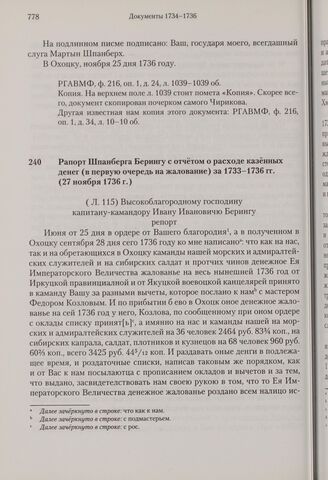 Рапорт Шпанберга Берингу с отчетом о расходе казенных денег (в первую очередь на жалование) за 1733-1736 гг. 27 ноября 1736 г. // РГАВМФ, ф. 216, оп. 1, д. 18, л. 115-124.