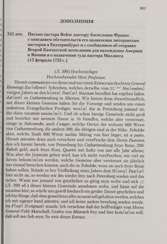 Письмо пастора Вейзе доктору богословия Франке с описанием обстоятельств его назначения лютеранским пастором в Екатеринбурге и с сообщением об отправке Второй Камчатской экспедиции для нахождения Америки и Японии и о назначении туда пастора Миллиеса. 12 февраля 1733 г.