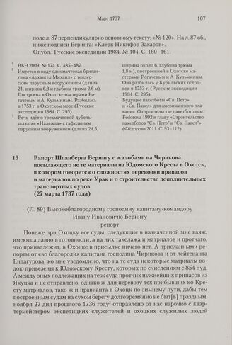 Рапорт Шпанберга Берингу с жалобами на Чирикова, посылающего не те материалы из Юдомского Креста в Охотск, в котором говорится о сложностях перевозки припасов и материалов по реке Урак и о строительстве дополнительных транспортных судов. 27 марта 1737 г. // РГАВМФ. Ф. 216. Оп. 1. Д. 25. Л. 89-90.
