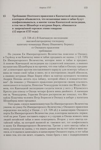 Требование Охотского правления к Камчатской экспедиции, в котором объявляется, что незаконные вино и табак будут конфисковываться, а многие члены Камчатской экспедиции, в том числе Шпанберг и штурман Бирев, обвиняются в запрещенной торговле этими товарами. 12 апреля 1737 г. // РГАДА. Ф. 248. Оп. 21. Кн. 1361. Л. 728 об.-730.