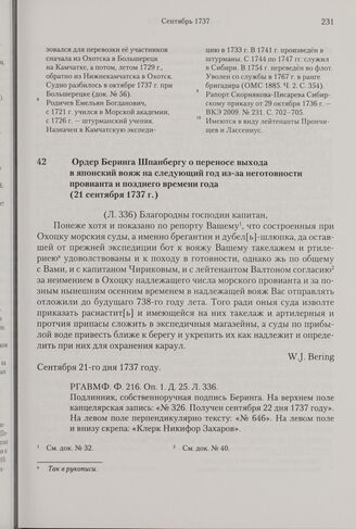 Ордер Беринга Шпанбергу о переносе выхода в японский вояж на следующий год из-за неготовности провианта и позднего времени года. 21 сентября 1737 г.