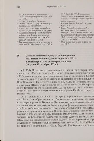Справка Тайной канцелярии об определении сказавшего «слово и дело» кондуктора Штеля в монастырь как «в уме поврежденного». Не ранее 10 октября 1737 г. // РГАДА. Ф. 7. Оп. 1. Д. 477. Л. 194-195.