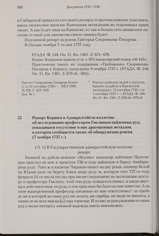 Рапорт Беринга в Адмиралтейств-коллегию об исследовании профессором Гмелиным найденных руд, показавшем отсутствие в них драгоценных металлов, в котором сообщается также об обнаружении ревеня. 7 ноября 1737 г.