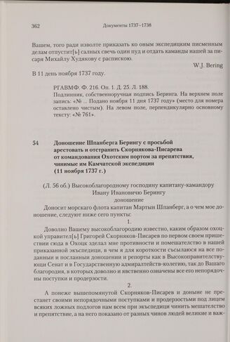 Доношение Шпанберга Берингу с просьбой арестовать и отстранить Скорнякова-Писарева от командования Охотским портом за препятствия, чинимые им Камчатской экспедиции. 11 ноября 1737 г. // РГАВМФ. Ф. 216. Оп. 1. Д. 94. Л. 56 об.-57.