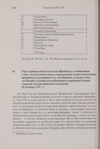 Указ Адмиралтейств-коллегии Шпанбергу с сообщением о том, что коллегия в споре о строительстве судов и потоплении провианта поддерживает его, а не Беринга, а также о том, что Берингу указано на необходимость проявлять больше старания для продвижения экспедиции. 8 декабря 1737 г. // РГАВМФ. Ф. 216. Оп. 1. Д. 2. Л. 26-27.