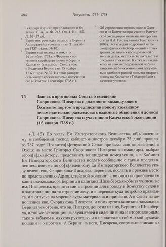 Запись в протоколах Сената о смещении Скорнякова-Писарева с должности командующего Охотским портом и предписании новому командиру незамедлительно расследовать взаимные обвинения и доносы Скорнякова-Писарева и участников Камчатской экспедиции. 16 января 1738 г. // РГАДА. Ф. 248. Оп. 34. Кн. 2112 (Протоколы Сената за январь 1738 г.). Л. 46-46 об.