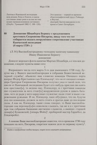Доношение Шпанберга Берингу с предложением арестовать Скорнякова-Писарева, ввиду того что тот собирается оказать вооруженное сопротивление участникам Камчатской экспедиции. 6 марта 1738 г.
