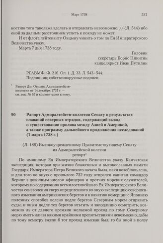Рапорт Адмиралтейств-коллегии Сенату о результатах плаваний северных отрядов, содержащий вывод о существовании пролива между Азией и Америкой, а также программу дальнейшего продолжения исследований. 7 марта 1738 г. // РГАДА. Ф. 248. Оп. 12. Кн. 669. Л. 188-193.