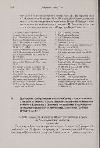Доношение Адмиралтейств-коллегии Сенату о том, что в связи с отказом со стороны Сената утвердить назначение лейтенантов Римского-Корсакова и Лопухина комиссарами в Камчатскую экспедицию назначаются лейтенанты Ларионов и Толбугин. 9 марта 1738 г. // РГАДА. Ф. 248. Оп. 21. Кн. 1366. Л. 309-309 об. РГАВМФ. Ф. 216. Оп. 1. Д. 24. Л. 364-364 об.