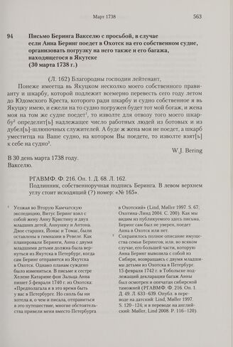 Письмо Беринга Вакселю с просьбой, в случае если Анна Беринг поедет в Охотск на его собственном судне, организовать погрузку на него также и его багажа, находящегося в Якутске. 30 марта 1738 г. // РГАВМФ. Ф. 216. Оп. 1. Д. 68. Л. 162.