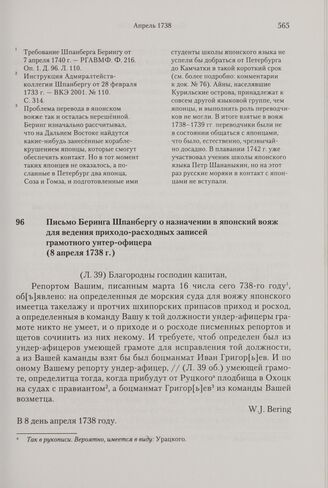 Письмо Беринга Шпанбергу о назначении в японский вояж для ведения приходо-расходных записей грамотного унтер-офицера. 8 апреля 1738 г. // РГАВМФ. Ф. 216. Оп. 1. Д. 31. Л. 39-39 об.