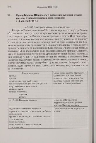Ордер Беринга Шпанбергу о выделении кухонной утвари на суда, отправляющиеся в японский вояж. 11 апреля 1738 г. // РГАВМФ. Ф. 216. Оп. 1. Д. 31. Л. 47-48.