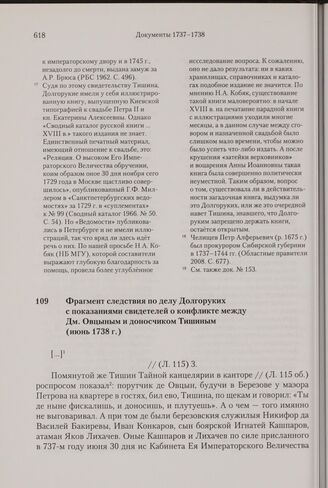Фрагмент следствия по делу Долгоруких с показаниями свидетелей о конфликте между Дм. Овцыным и доносчиком Тишиным. Июнь 1738 г. // РГАДА. Ф. 6. Оп. 1. Д. 181 (Экстракты из дела о кн. Долгоруковых по доносу канцеляриста Осипа Тишина и о составлении подложного завещания от имени имп. Петра II). Ч. 3. Л. 115-118.