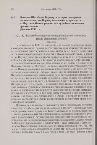 Известие Шпанберга Берингу, в котором он выражает согласие с тем, что Берингу незачем было приезжать из Якутска в Охотск раньше, чем туда было доставлено продовольствие. 10 июня 1738 г. // РГАВМФ. Ф. 216. Оп. 1. Д. 96. Л. 132-133. РТЭ, 1979. С. 193.