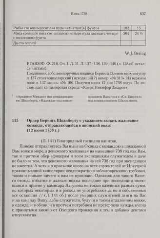 Ордер Беринга Шпанбергу с указанием выдать жалование команде, отправляющейся в японский вояж. 12 июня 1738 г. // РГАВМФ. Ф. 216. Оп. 1. Д. 31. Л. 141-142, 143-152.