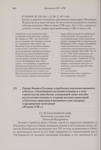 Рапорт Беринга Головину о проблемах перевозки провианта в Охотск, о бедственном состоянии команды и о ходе строительства пакетботов, содержащий также жалобы на отсутствие помощи со стороны местных канцелярий и Охотского правления и вызванную этим задержку в продвижении экспедиции. 30 июня 1738 г. // РГАВМФ. Ф. 230. Оп. 1. Д. 30. Л. 8-13. Экспедиция Беринга, 1941. С. 304-308; Русские экспедиции, 1984. № 109. С. 163.