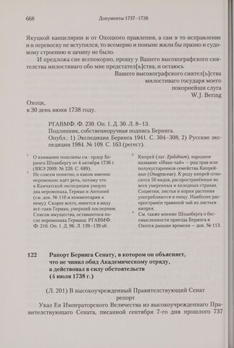 Рапорт Беринга Сенату, в котором он объясняет, что не чинил обид Академическому отряду, а действовал в силу обстоятельств. 4 июля 1738 г. // РГАДА. Ф. 248. Оп. 4. Кн. 180. Ч. 1. Л. 201-204.