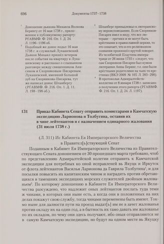Приказ Кабинета Сенату отправить комиссарами в Камчатскую экспедицию Ларионова и Толбугина, оставив их в чине лейтенантов и с назначением одинарного жалования. 31 июля 1738 г.