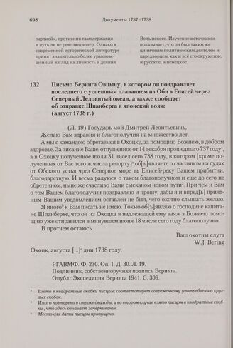 Письмо Беринга Овцыну, в котором он поздравляет последнего с успешным плаванием из Оби в Енисей через Северный Ледовитый океан, а также сообщает об отправке Шпанберга в японский вояж. Август 1738 г. // РГАВМФ. Ф. 230. Оп. 1. Д. 30. Л. 19. Экспедиция Беринга, 1941. С. 309.