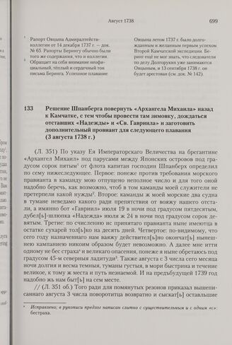 Решение Шпанберга повернуть «Архангела Михаила» назад к Камчатке, с тем чтобы провести там зимовку, дождаться отставших «Надежды» и «Св. Гавриила» и заготовить дополнительный провиант для следующего плавания. 3 августа 1738 г. // РГАВМФ. Ф. 216. Оп. 1. Д. 31. Л. 351-351 об.