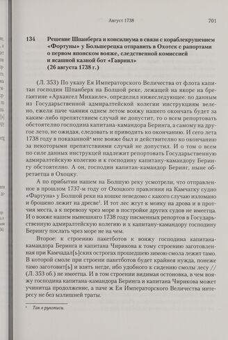 Решение Шпанберга и консилиума в связи с кораблекрушением «Фортуны» у Большерецка отправить в Охотск с рапортами о первом японском вояже, следственной комиссией и ясашной казной бот «Гавриил». 26 августа 1738 г. // РГАВМФ. Ф. 216. Оп. 1. Д. 31. Л. 353-354 об.