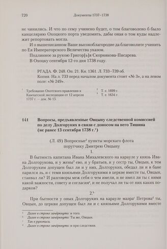 Главная Вторая камчатская экспедиция 1730-1742 Вторая Камчатская экспедиция. Морские отряды. [Ч. 3.] 1737-1738 Вопросы, предъявленные Овцыну следственной комиссией по делу Долгор...
