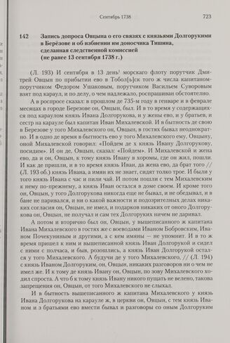 Запись допроса Овцына о его связях с князьями Долгорукими в Березове и об избиении им доносчика Тишина, сделанная следственной комиссией. Не ранее 13 сентября 1738 г. // РГАДА. Ф. 6. Оп. 1. Д. 178 (Следствие и розыск, которые производили в Тобольске капитан Ф. Ушаков и поручик В. Суворов о князьях Долгоруковых вследствие доноса подьячего Осипа Тишина). Ч. 1. Л. 193-197 об.