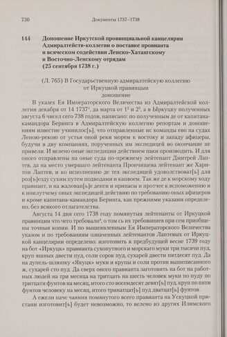 Доношение Иркутской провинциальной канцелярии Адмиралтейств-коллегии о поставке провианта и всяческом содействии Ленско-Хатангскому и Восточно-Ленскому отрядам. 25 сентября 1738 г. // РГАВМФ. Ф. 216. Оп. 1. Д. 24. Л. 765-769 об.