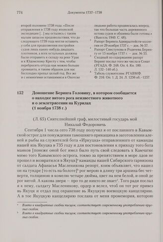Доношение Беринга Головину, в котором сообщается о находке витого рога неизвестного животного и о землетрясении на Курилах. 1 ноября 1738 г.