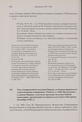 Указ Адмиралтейств-коллегии Овцыну, в котором выражается удовлетворение плаваниями «Тобола» и «Оби-Почтальона», а самому Овцыну, если он не проходит по делам Тайной канцелярии, предписывается явиться для отчета в Петербург. 8 ноября 1738 г.