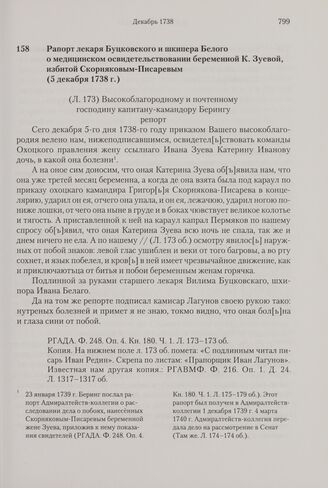 Рапорт лекаря Буцковского и шкипера Белого о медицинском освидетельствовании беременной К. Зуевой, избитой Скорняковым-Писаревым. 5 декабря 1738 г. // РГАДА. Ф. 248. Оп. 4. Кн. 180. Ч. 1. Л. 173-173 об. РГАВМФ. Ф. 216. Оп. 1. Д. 24. Л. 1317-1317 об.