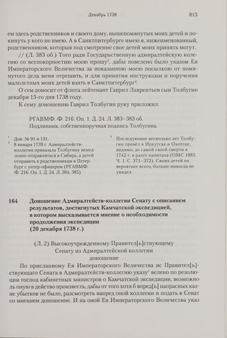 Доношение Адмиралтейств-коллегии Сенату с описанием результатов, достигнутых Камчатской экспедицией, в котором высказывается мнение о необходимости продолжения экспедиции. 20 декабря 1738 г. // РГАДА. Ф. 248. Кн. 1327. Л. 2-5. РГАВМФ. Ф. 216. Оп. 1. Д. 24. Л. 1097-1100 об.
