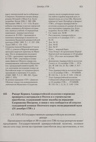 Рапорт Беринга Адмиралтейской коллегии о перевозке провианта и материалов в Охотск и о строительстве пакетботов, содержащий также жалобы на нерадение Скорнякова-Писарева, в связи с чем сообщается об отпуске голодающей команде Охотского порта экспе...