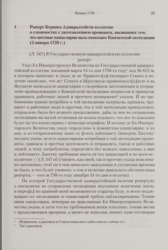 Рапорт Беринга Адмиралтейств-коллегии о сложностях с заготовлением провианта, вызванных тем, что местные канцелярии мало помогают Камчатской экспедиции. 3 января 1739 г. // РГАВМФ. Ф. 216. Оп. 1. Д. 24. Л. 347-348 об.