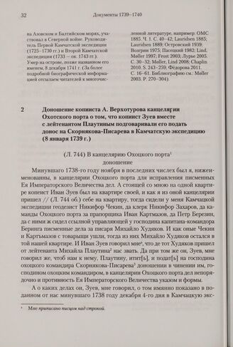 Доношение копииста А. Верхотурова канцелярии Охотского порта о том, что копиист Зуев вместе с лейтенантом Плаутиным подговаривали его подать донос на Скорнякова-Писарева в Камчатскую экспедицию. 8 января 1739 г. // РГАДА. Ф. 248. Оп. 21. Кн. 1361. Л. 744-747.