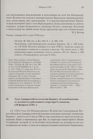 Указ Адмиралтейств-коллегии Берингу об освобождении от должности заболевшего секретаря Селиванова. 10 февраля 1739 г. // РГАВМФ. Ф. 216. Оп. 1. Д. 24. Л. 1231-1232.