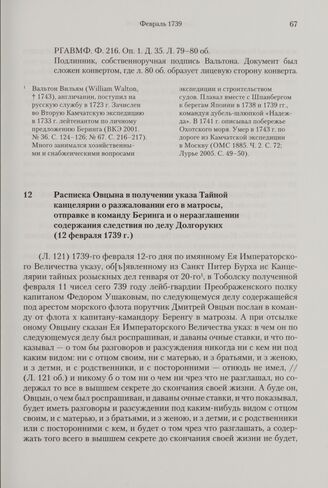 Расписка Овцына в получении указа Тайной канцелярии о разжаловании его в матросы, отправке в команду Беринга и о неразглашении содержания следствия по делу Долгоруких. 12 февраля 1739 г.