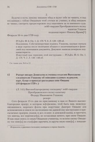 Рапорт писаря Денисьева и ученика геодезии Выходцева следователю Ушакову об описании судовых журналов, карт, бумаг и приходо-расходных книг Овцына. 16 февраля 1739 г. // РГАДА. Ф. 6. Оп. 1. Д. 178. Ч. 2. Л. 141-144 об.